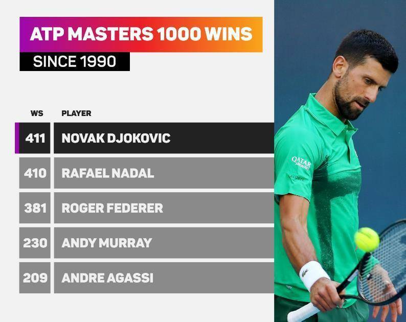 在赢下这场同卡拉贝利的比赛之后,德约科维奇创造了一项新的ATP纪录——这是他第411场大师赛胜利,超越了410胜的纳达尔,独享大师赛历史胜场王。