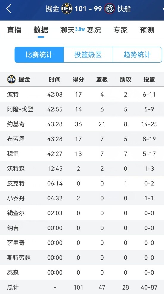 4月28日讯 昨天掘金客场101-99险胜快船,将大比分扳为2-2。