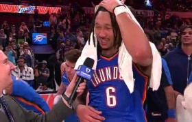 一帮损友🤣杰林威赛后接受采访 众队友捣蛋轮番往其头上放纸杯